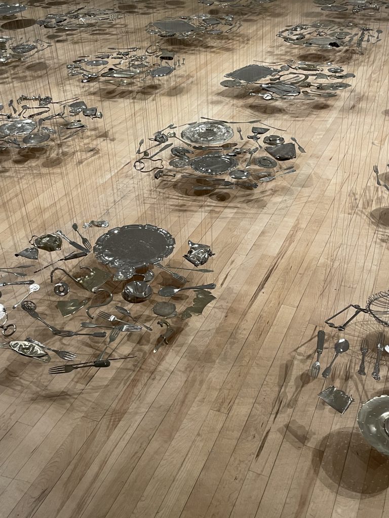 It was my first time visiting Tate Britain, so this exhibition was especially interesting. Cornelia Parker is a diverse artist who uses many different methods and mediums to create her work. The first installation as you walk in is the very powerful “Thirty Pieces of Silver”. Visually I was very drawn to this installation, the reflective light of the silver and the feeling of weightlessness of the silverware. Creating the lost volume of the crushed plates with simply empty space and shadow.