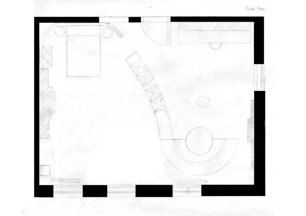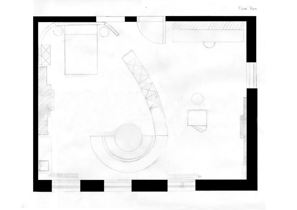 Playing with the Fibonacci circle, I was able to create a wall that could spiral into a sofa space, and be removed and moved along the wall from the living space into the artist studio. The sofa space then serves as a place to relax after work, but once moved, it is a place for contemplation in the studio. I was happy with the result but I would very much like to extend the design of the wall. Factoring in the bed and work desk. Maybe they can be connected to the wall and continue with the idea of the Fibonacci circle.