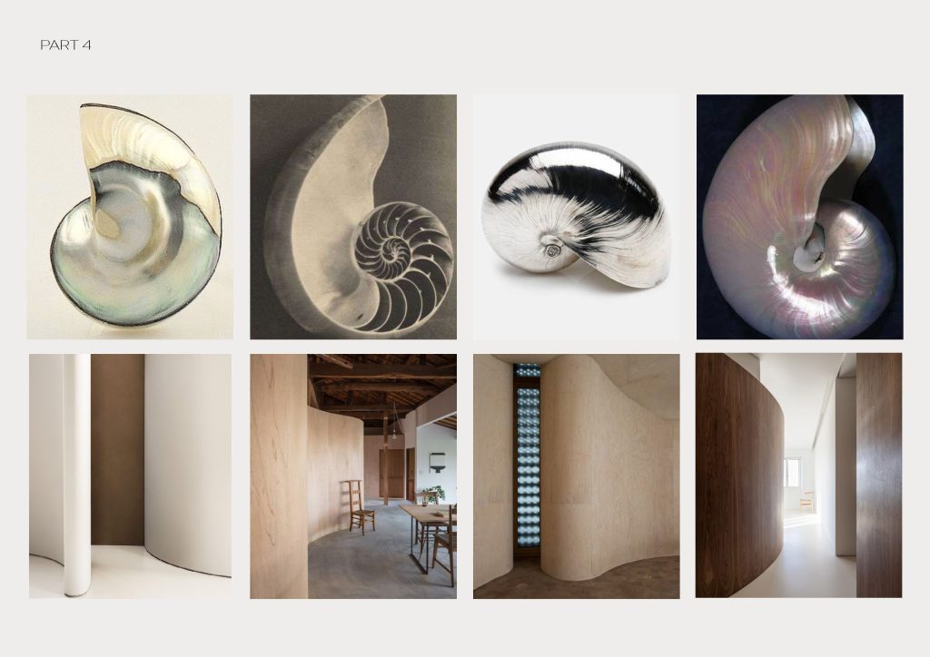 Designing a single space for an artist to live and work in, while also having it temporary can create some challenges. My client is a female artist who collects sea shells and uses their form and texture as a source of inspiration. She prefers minimal space and keeping her work and living area separate. My starting point with the design was to explore the sea shells and how she interacts with with her collection. I wanted to be able to divide the room, but also allowing her to adjust the movement of the furniture easily. I researched different types of sea shells, and I was especially inspired by the shape of the nautilus shell and used that form to create sketches for a wall. At first the wall was too rigid and didn’t have the correct flow to it. While it was functional, it didn’t move enough with the room and relation with other pieces in the room.